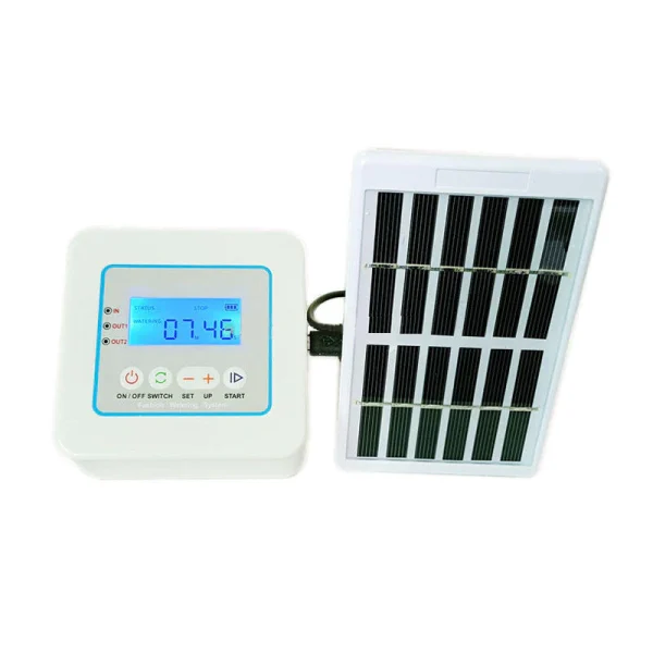 A powerful pump powered by a solar panel and battery that is ideal for watering 20 plants away from an outlet.